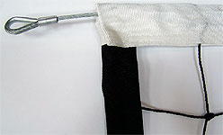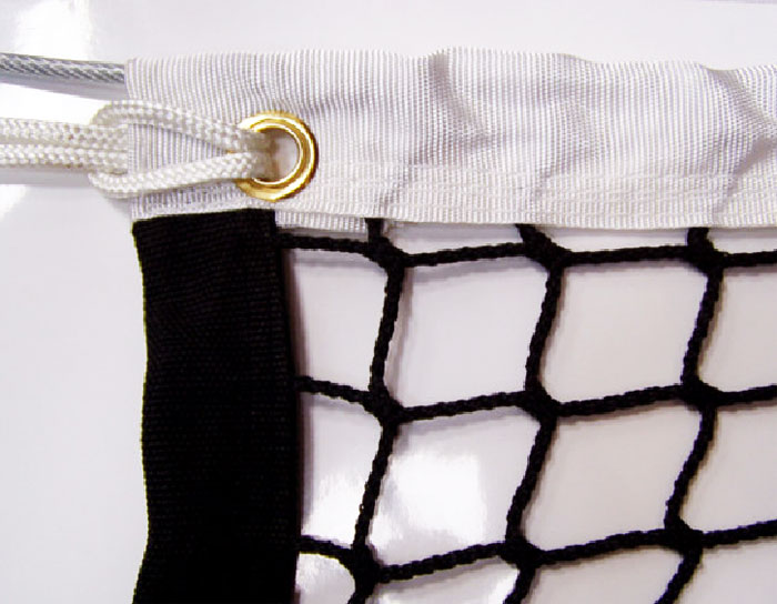 Siatka wzmocniona 3 mm sznurem z trzech boków, z góry obszyta białą taśmą o szerokości 10 mm, naciąg z linki stalowej o średnicy 5 mm. |
